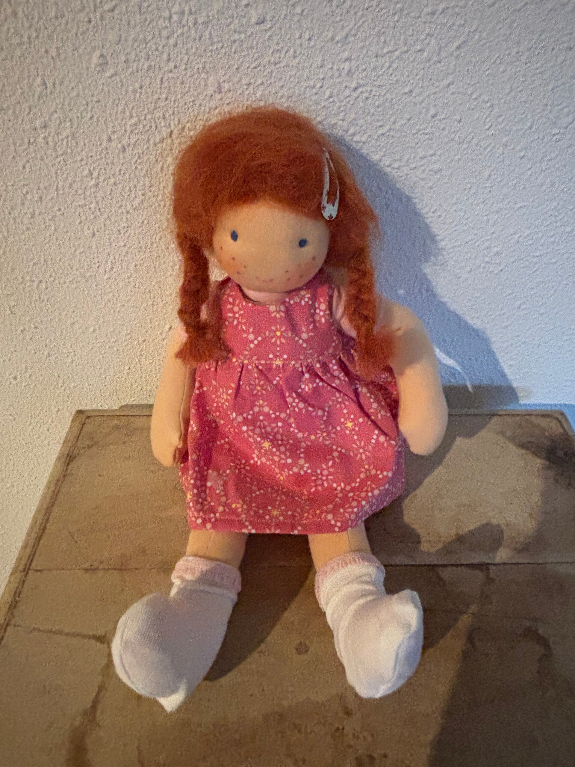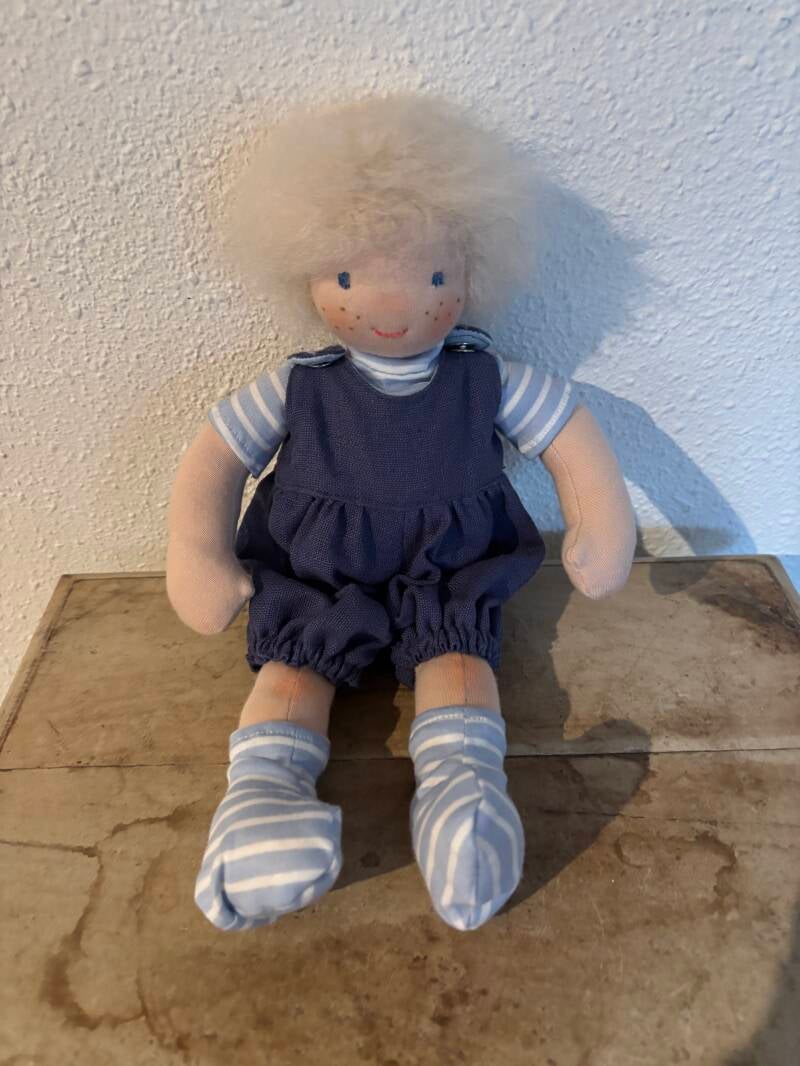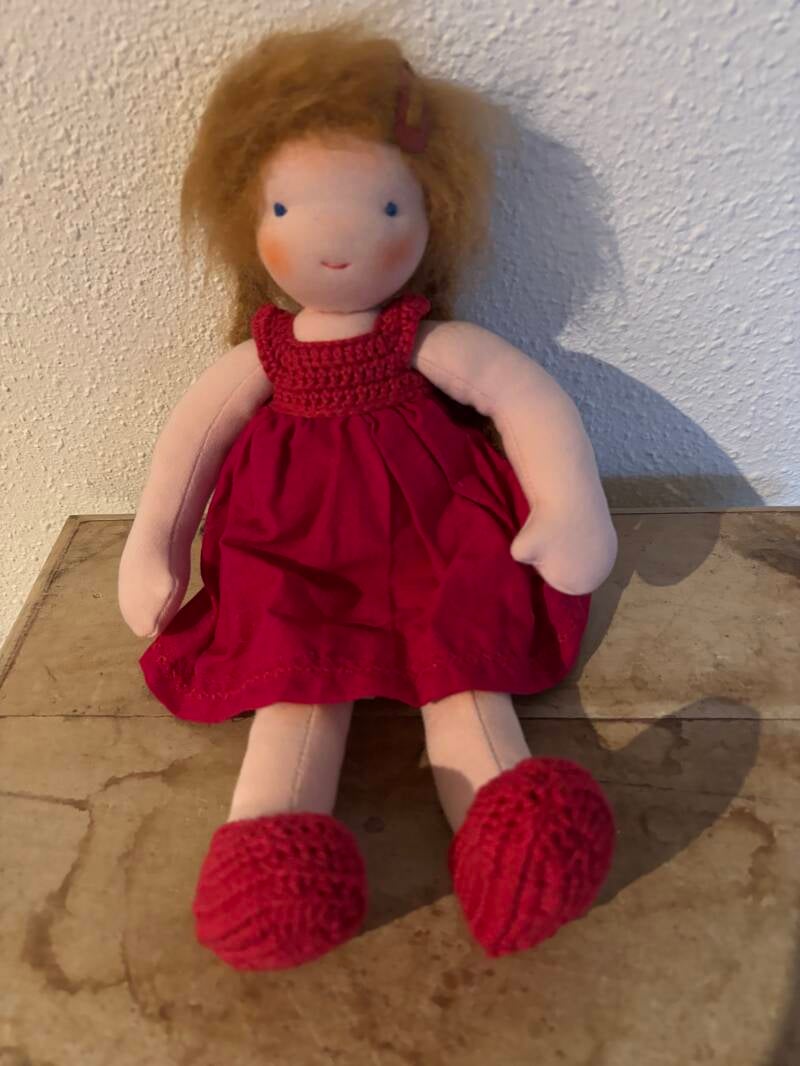 Links is Dikkertje Dap, inclusief rode laarsjes. Hij is 30 cm hoog en helemaal handwerk. De prijs is 50 euro